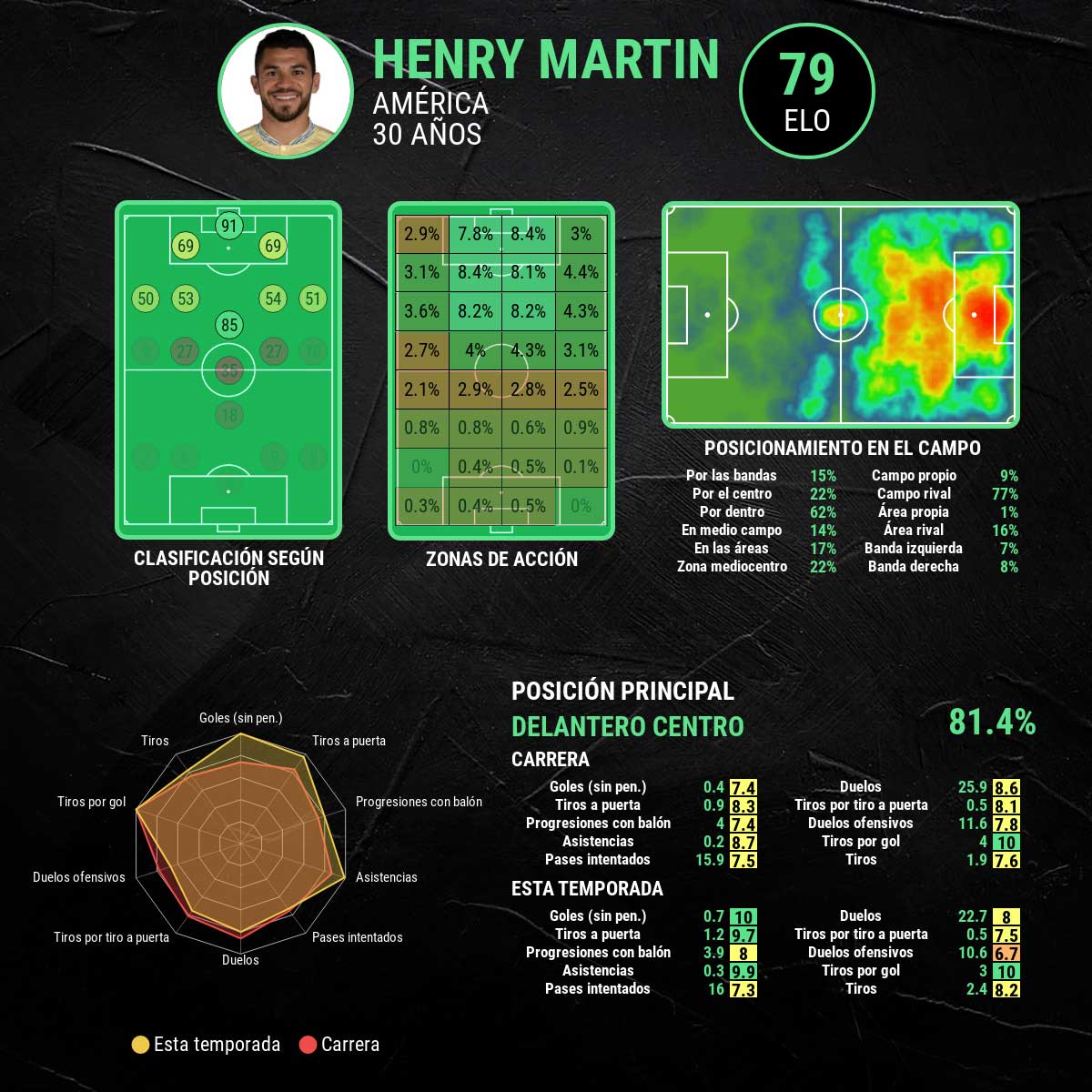 Esta temporada 2022-23 es sin dudas la mejor de Henry Martín. No en vano, su rendimiento le llevó a jugar el Mundial de Catar 2022 y a ser titular en dos de los tres partidos de la fase de grupos. Además, llegó a marcar un gol en el insuficiente triunfo de México frente a Arabia Saudí en la última jornada. Después de un rendimiento más pobre en el anterior curso, en este ha roto todas sus cifras de goles y asistencias en el fútbol patrio.