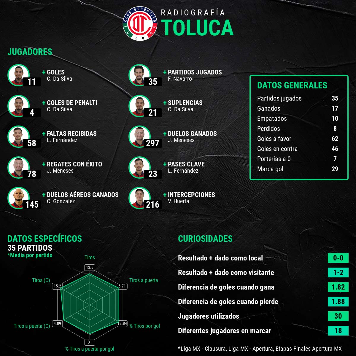 El volante es uno de los cerebros de Toluca, donde ya tuvo sus mejores destellos en 2019 y donde se vuelve a exhibir tras un infructífero paso por Tigres. Es cierto que en las últimas semanas ha perdido algo de protagonismo, de hecho Marcel Ruiz y Meneses le arrebataron el lugar durante varios partidos en el once, pero se espera que siga siendo importante en este tramo final.